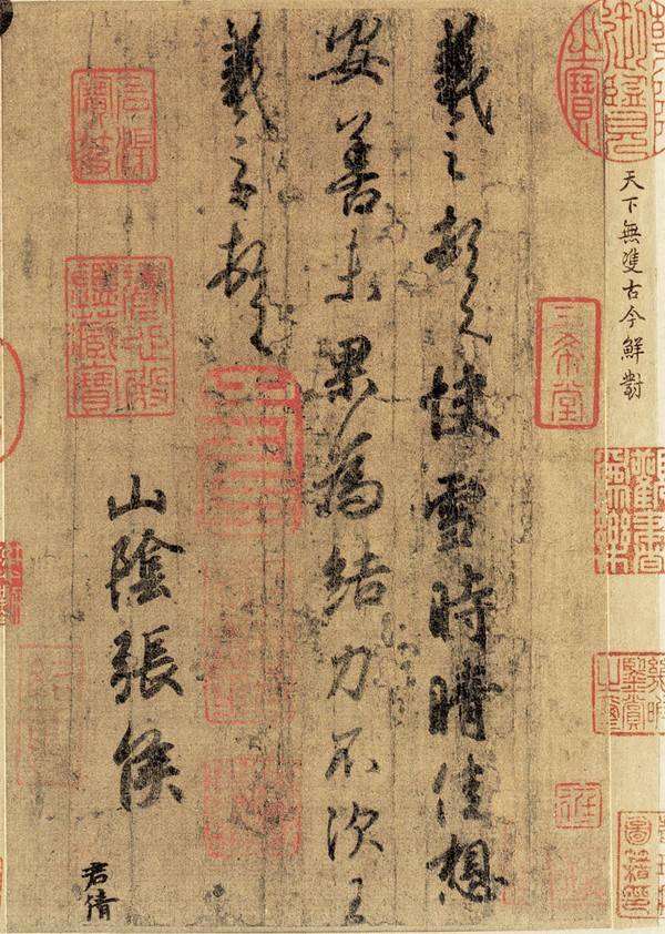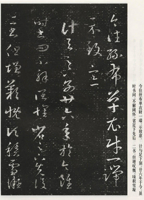 《十七帖》是王羲之草书代表作,因卷首由“十七”二字而得名。 原墨迹早佚,现传世《十七帖》是刻本。 唐张彦远《法书要录》记载了《十七帖》原墨迹的情况: “《十七帖》长一丈二尺,即贞观中内本也,一百七行,九百四十三字。 是煊赫著名帖也。 太宗皇帝购求二王书,大王书有三千纸,率以一丈二尺为卷,取其书迹与言语以类相从缀成卷。 ”此帖为一组书信,据考证是写给他朋友益州刺史周抚的。 书写时间从永和三年到升平五年(公元347-361年),时间长达十四年之久,是研究王羲之生平和书法发展的重要资料。 清人包世臣有《十七帖疏征》一文可以参考。