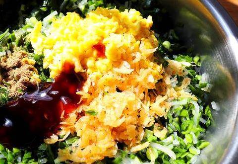 五步:接下来倒入炒好的鸡蛋碎、虾皮,加入一勺蚝油,少量十三香,适量盐再淋少许香油搅拌均匀即可,这样我们的韭菜馅就调好了。