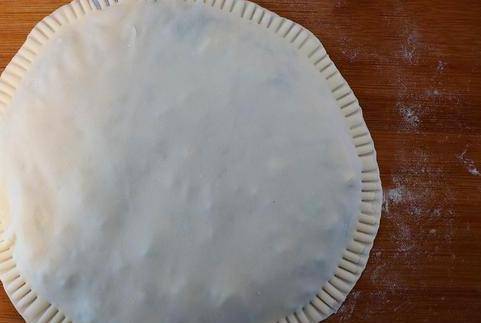 第十步:然后薄饼的四面抹上一圈清水,防止开,再盖上另一张面饼,用手压实再将边缘捏严实,可以用叉子在饼的一圈按出花纹。