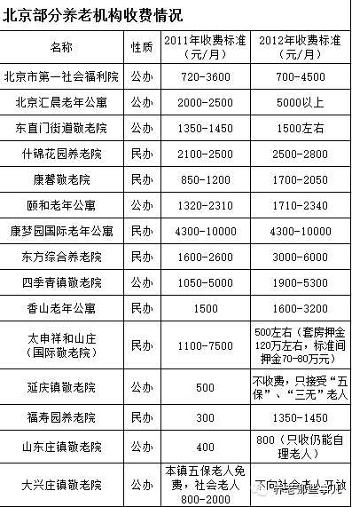 “一般来说,一个房间里两张床,带卫生间的这种,床位费较多的是1000~1500元/月。加上伙食费,至少得1500~2000元/月左右。根据老人的身体状况,护理费按照等级收费不一样。加上护理费一般为2500~3000元/月,这是一个大概,一个中间水平。”据北京市民政局的一名工作人员介绍,目前在北京市民政局官方网站上的356个养老机构的基本信息,是该局于2011年10月披露的。另有45家养老机构并未按要求上报相关信息。
