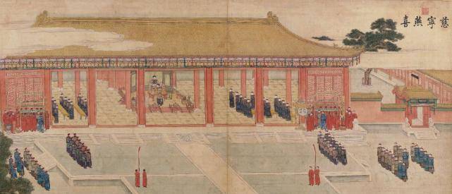 《胪欢荟景图册·慈宁燕喜》描绘了乾隆帝在皇太后生活的慈宁宫内,亲自双手捧觞为其贺寿的场面。