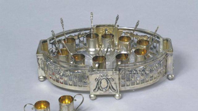 ▲银制咖啡具,清晚期,盘长32厘米,宽22厘米,高85厘米;杯高5厘米,直径3厘米;勺长10.5厘米。清宫旧藏。这套银制咖啡具是中西结合的产物,精微的玻璃杯具有西式小巧玲珑的特征,与之配合的咖啡勺柄上有清朝官员形象。整套咖啡具做工精巧,华贵高雅。