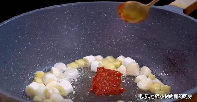 7.起锅倒食用油,油热倒葱姜蒜煸炒,炒出香味后,放一勺豆瓣酱,炒出酱香味。