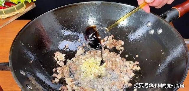 4.起锅烧油,油热下入肉末煸炒,炒至变色后,放入姜蒜末、老抽,翻炒上色。