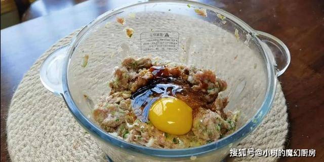 2.五花肉放绞肉机绞碎,然后让葱姜末拌匀,再打入一颗鸡蛋,放食盐、胡椒粉、生抽、蚝油、鸡精,搅拌均匀。