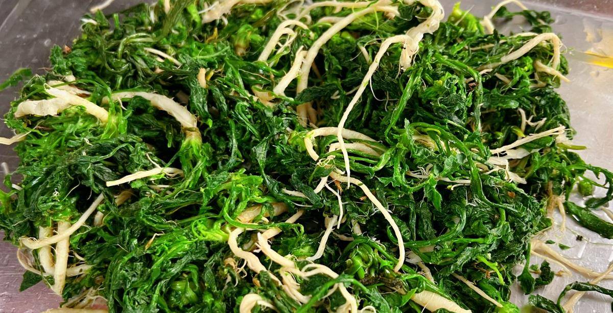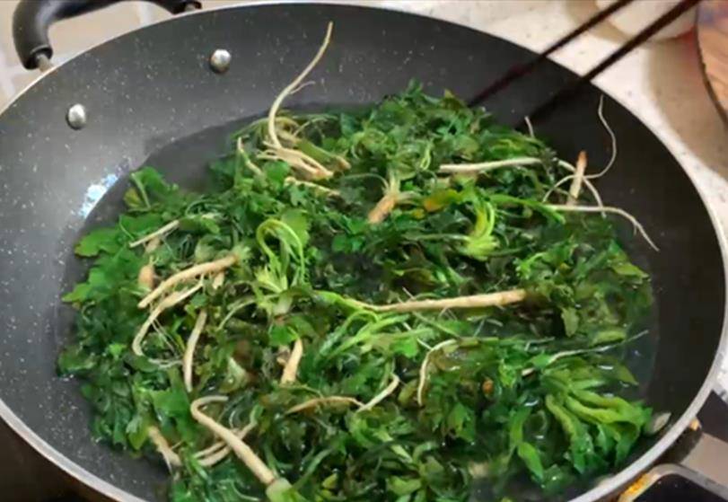 焯水后的荠菜直接倒入凉水中过凉,这也是荠菜不变色的一个小窍门。