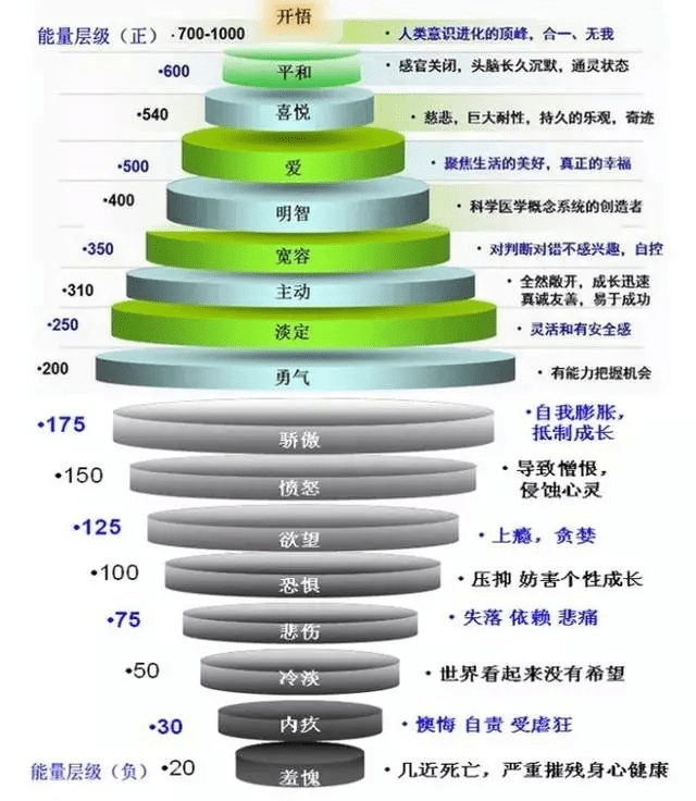 美国著名心理学教授大卫·霍金斯曾绘制了一幅“人类意识能量层级图谱”。