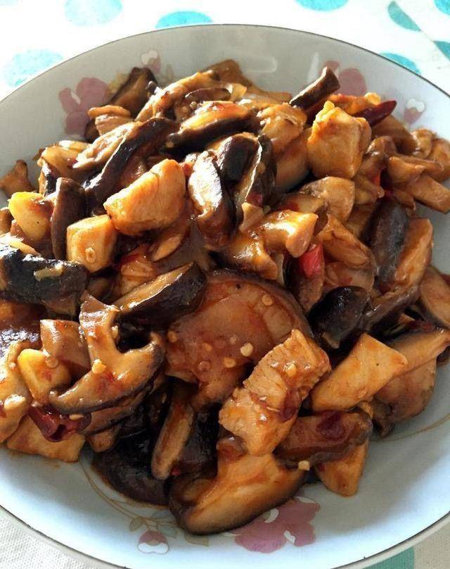 3.先把鸡块炒熟。待鸡丁香变色后,加入香菇丁翻炒。