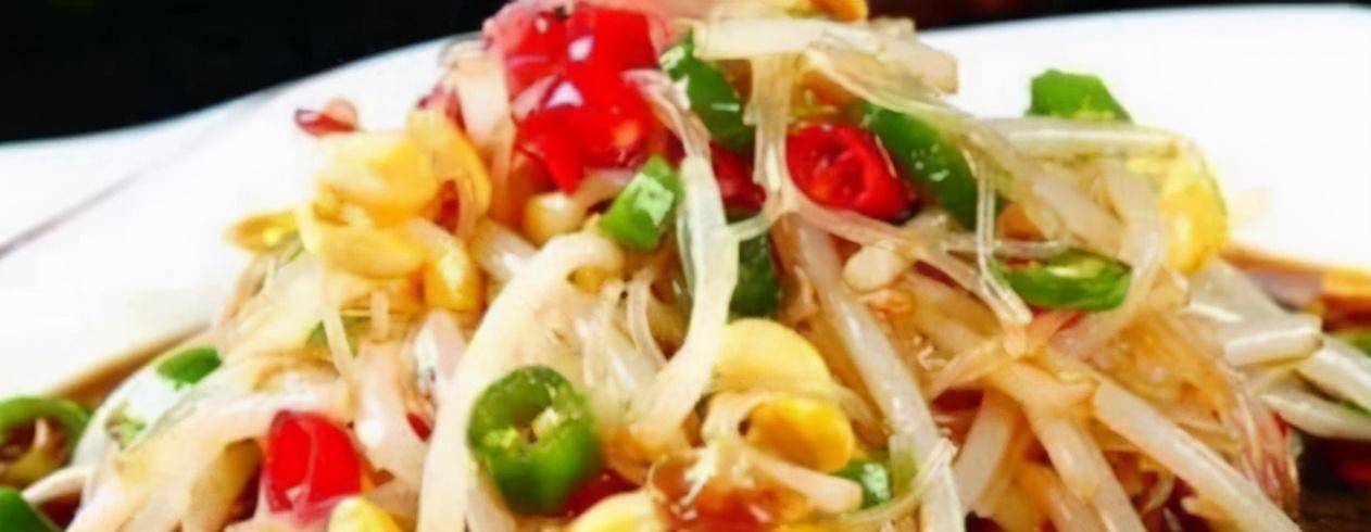 材料:粉丝1条,油炸花生米(不包衣),香菜叶各少许,红辣椒,野花椒,豆芽,辣椒油,陈醋,盐,香油各少许。