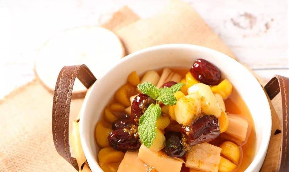 原料:栗子50克、红枣50克、藕半个、铁棒山药50克、麦芽糖适量、桂糖少许、生姜5克、冰糖少许