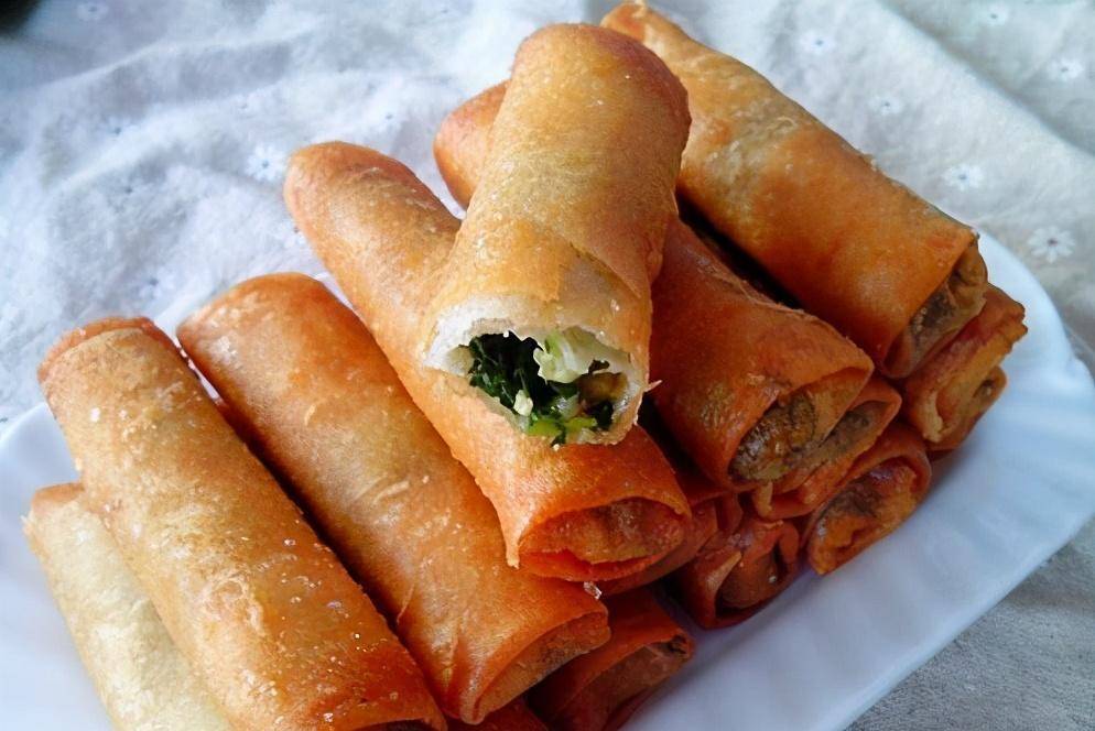 2、用春卷皮包好荠菜馅适量,卷起;在煎锅中煎至金黄色。