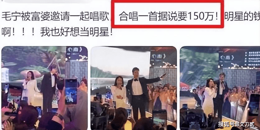 据悉这一次演出,毛宁的出场费不低,而且美女富婆还上场与毛宁合唱歌曲,网友爆料单次合唱一首歌,费用就高达150万,不得不说这明星的钱是真的太好赚了。