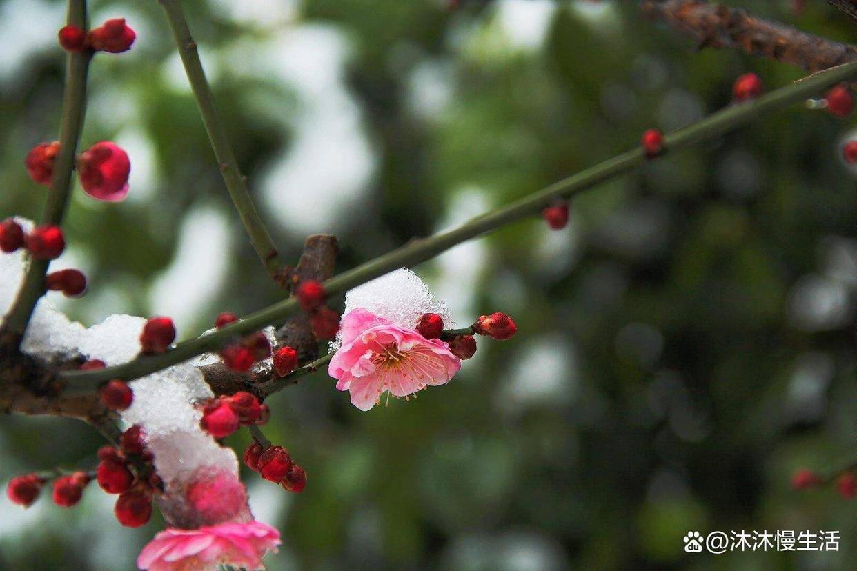 梅花的花朵大部分是白色或者粉色的,花期在2-3月份,可维持一个月左右,它的花先于叶开放,观赏价值非常高, 大雪天里独特的一抹风景与色彩。