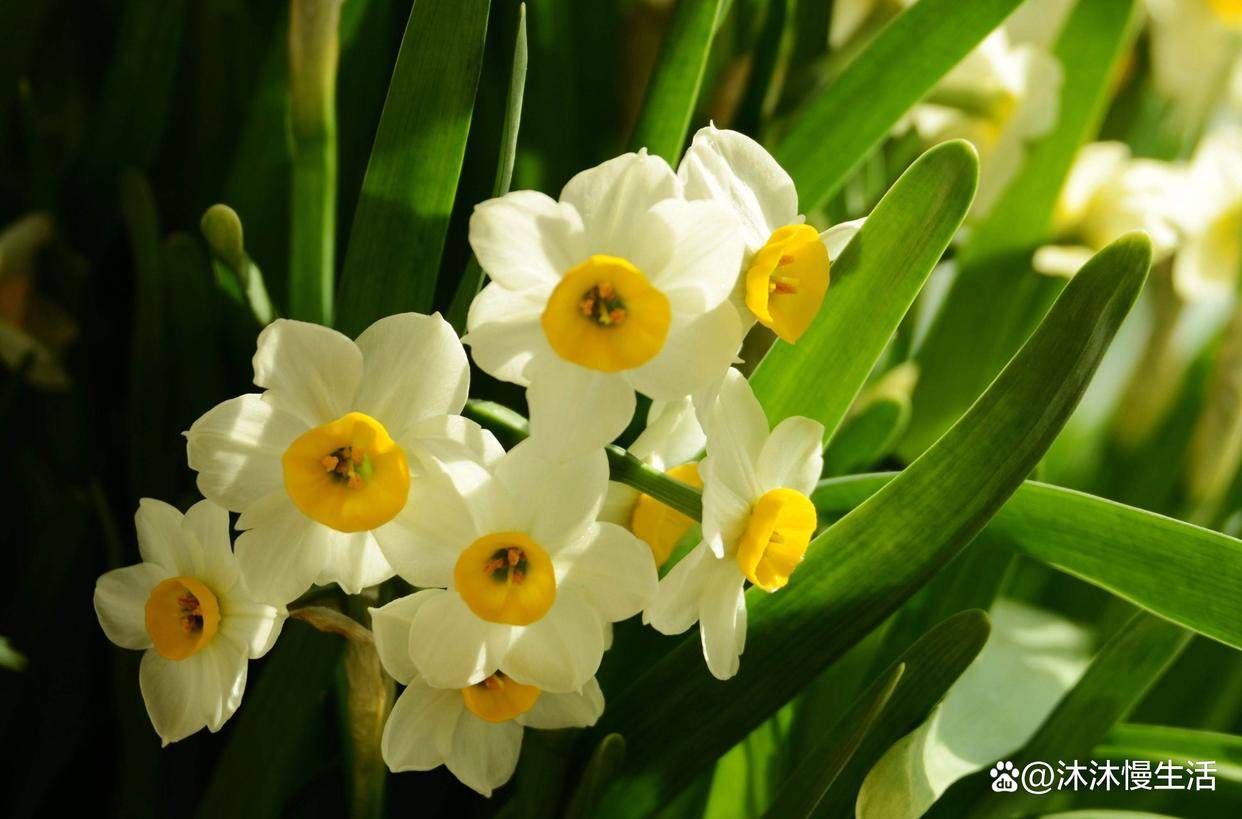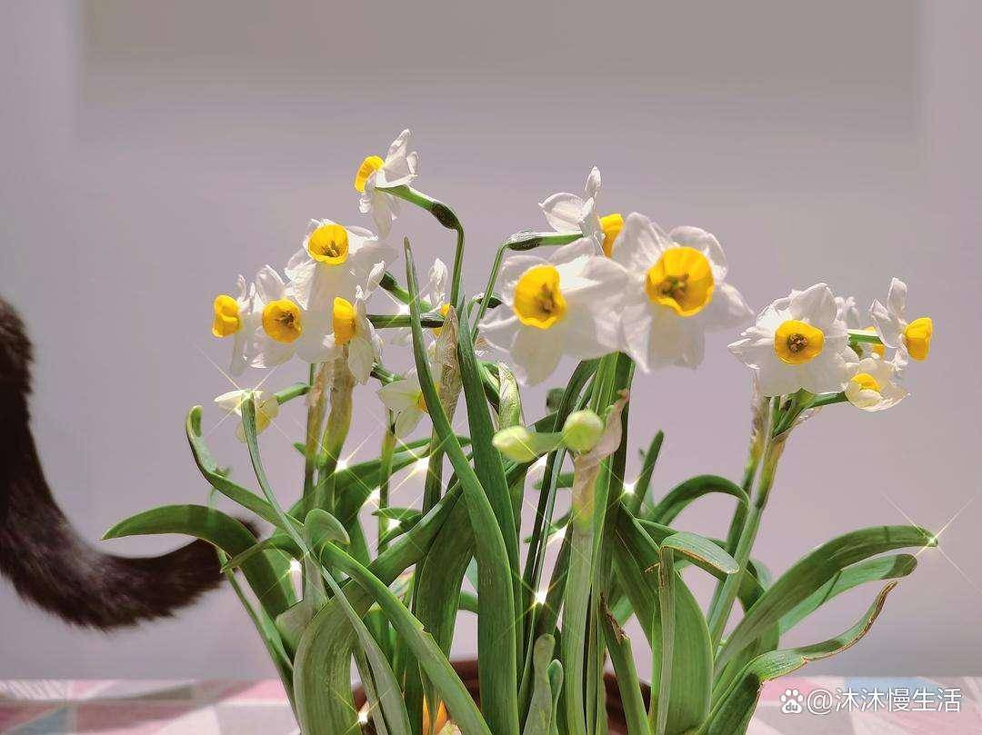 水仙的花朵洁白无瑕, 秀丽的花配上青翠欲滴的叶片,清丽出尘,作为室内陈设的花卉,它的高级感满满。