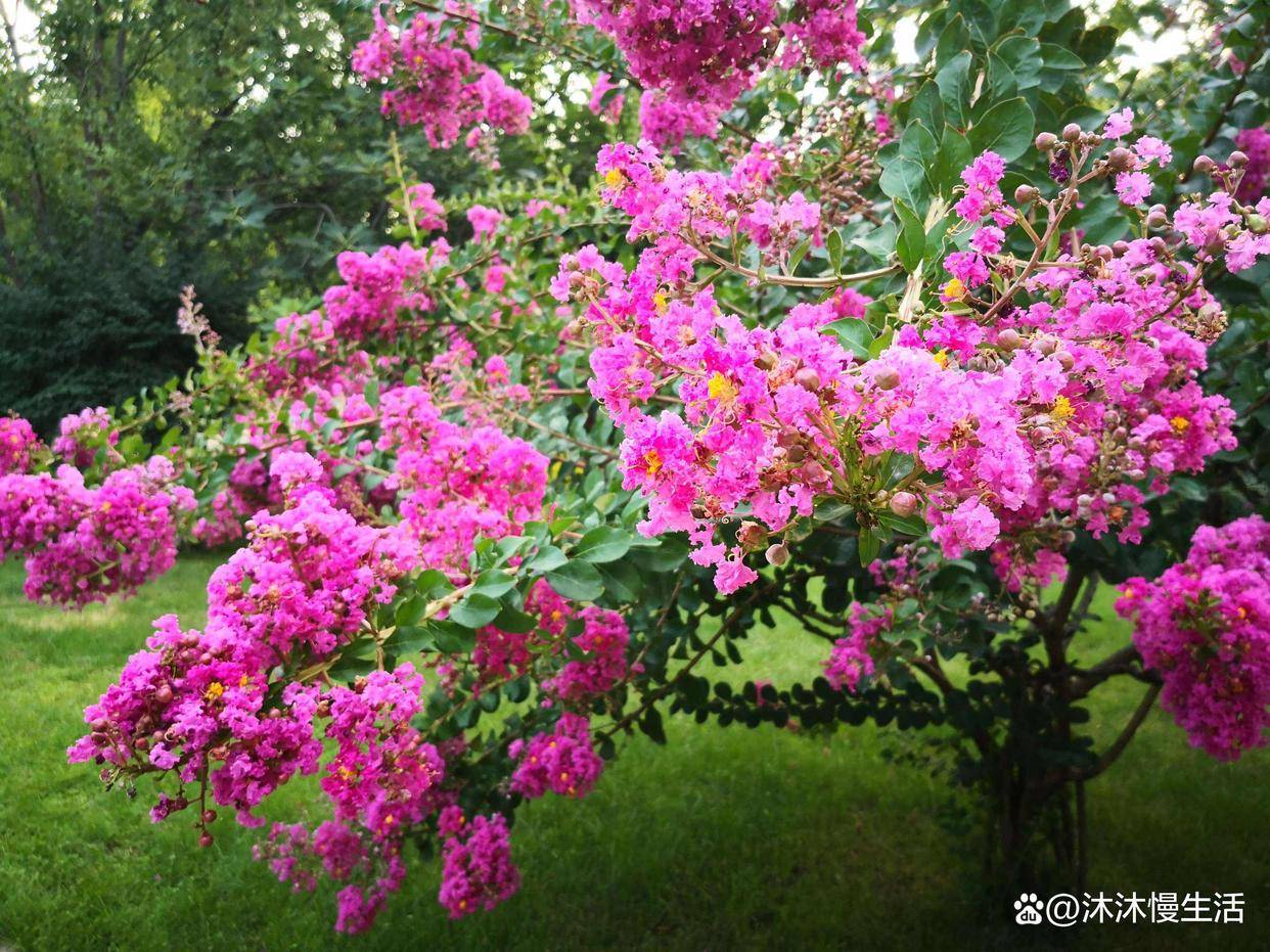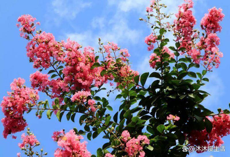 紫薇花的颜色丰富,有玫红、深粉红、大红色和紫色、白色等,花朵小巧,在 3-4厘米之间, ,紫薇的花期很久,盛花期可达4个月,从6月份开花一直持续到9月份 ,故也被称为“百日红” ,又有“盛夏绿遮眼,此花红满堂”的赞语。
