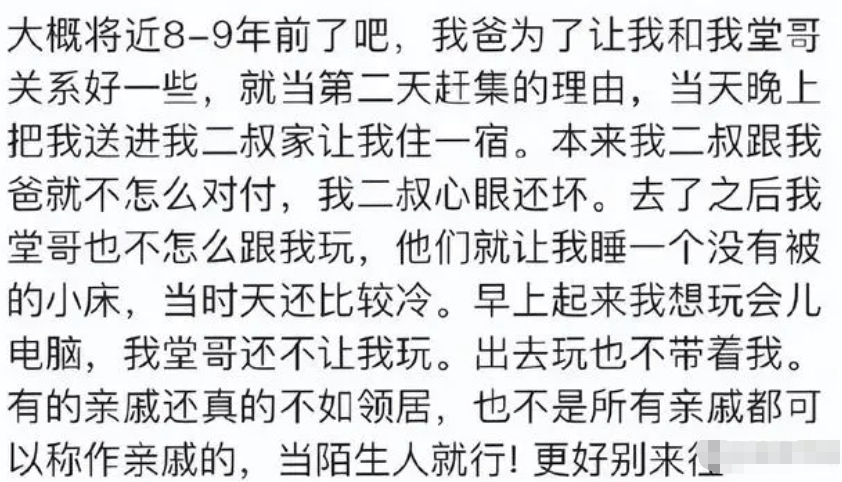 所以家庭的教育方式很重要,而网友的这个经历也是一个典型的反面教材,如果家长真的要寄养在亲戚家,也要咨询一下孩子的意见。