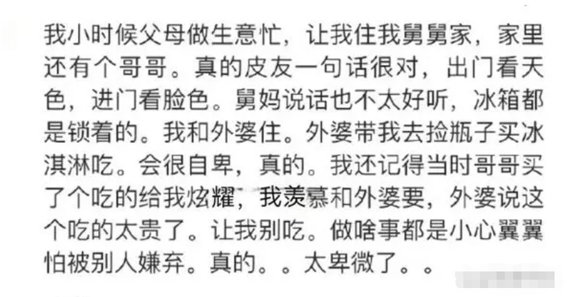 平时在家里都要看舅舅的脸色,而舅妈说话也很难听,每次自己在家里都要非常小心,就怕做错事或者说错话,最后遭人嫌弃,不得不说那时候真的很卑微,但也是无可奈何的事情。