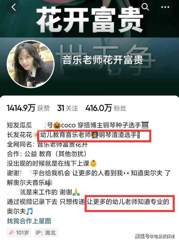 近期,一首幼儿园儿歌“挖呀挖”出圈了,唱这首歌的是一位幼儿老师,网名叫“音乐老师花开富贵”,老师长相貌美,声音甜美,教授的幼儿儿歌郎朗上口,让人印象深刻,由于老师气质很独特,吸引了很多网友的关注,黄老师短时间积累了很多的粉丝,人气直线上升。