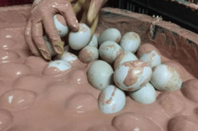 ,按照相应的比例调配,没有其他添加剂。调配成粘稠状后,把每一颗鸭蛋均匀的涂抹上红泥,密封腌制大约一个月左右。