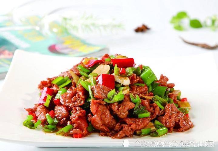食材:牛肉,料酒,胡椒粉,食盐,淀粉,食用油,青红辣椒,大葱。