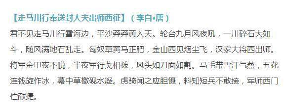 北风卷地白草折,胡天八月即飞雪。忽如一夜春风来,千树万树梨花开。散入珠帘湿罗幕,狐裘不暖锦衾薄。将军角弓不得控,都护铁衣冷难着。瀚海阑干百丈冰,愁云惨淡万里凝。中军置酒饮归客,胡琴琵琶与羌笛。纷纷暮雪下辕门,风掣红旗冻不翻。轮台东门送君去,去时雪满天山路。山回路转不见君,雪上空留马行处。