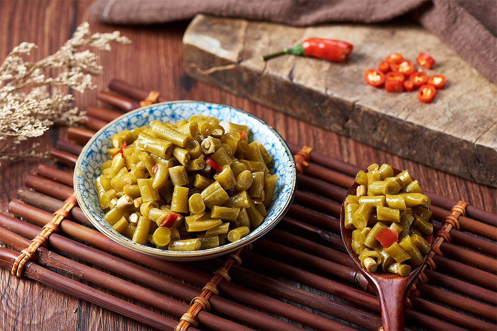 发酵成功的酸白菜和酸豆角呈现为淡黄色或是金黄色,口感嘎吱作响,酸香馥郁。可以直接生吃,或是成就其他的菜肴,素炒酸脆爽口,搭配肉类增香解腻。