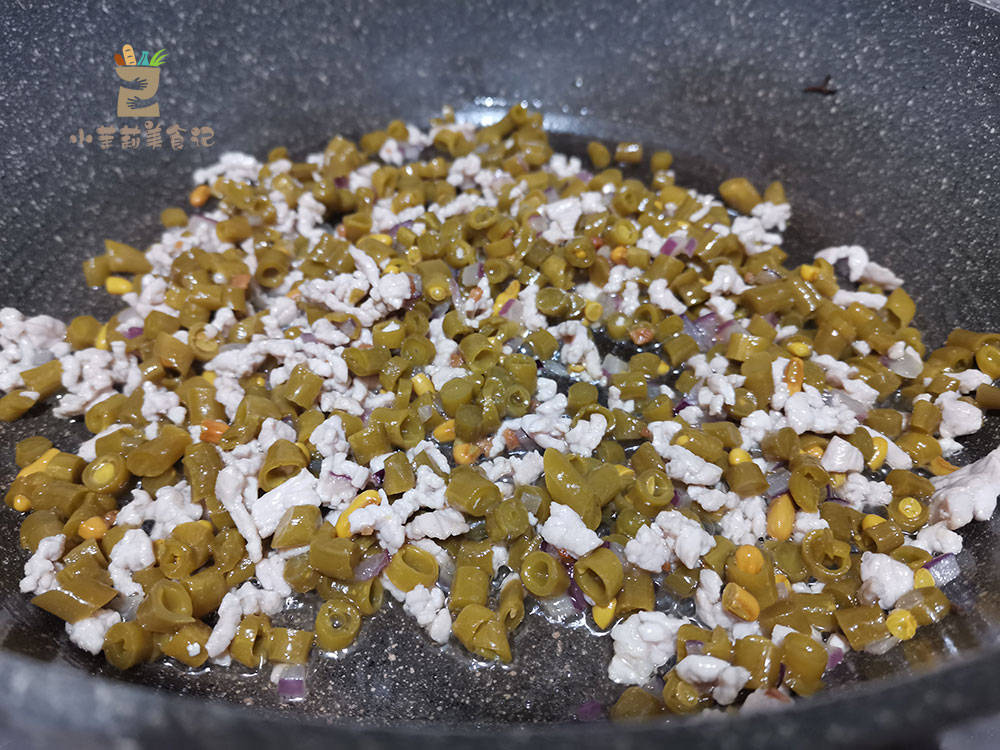 4、锅烧热,先把肥肉的部分倒进去进行煸炒,一直炒出油脂,把瘦肉倒进去,利用锅内的油脂炒到发白,倒入酸豆角一起炒,这样可以把酸豆角中的水分炒出去,口感会更脆。然后调入一些洋葱丁炒香。