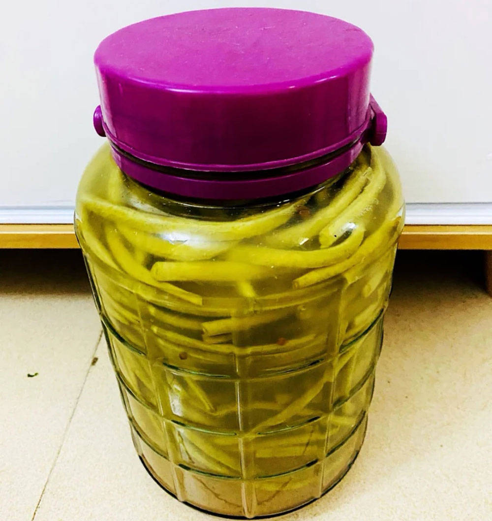 4、腌制酸豆角的容器,最好选择陶瓷或玻璃的材质,这样的材质腌制出来的食物没有异味。提前将容器洗净,并用开水进行杀菌,然后彻底晾干。将晒好的豆角依次盘好,码放到罐子里边,尽量码放得紧凑一些,既能节省空间,又能排出空气。接着把冷却的盐水倒进罐子里,水要确保将豆角全部浸没。最后淋入50克左右的白酒,将罐子口密封好,放到避光阴凉的地方即可。
