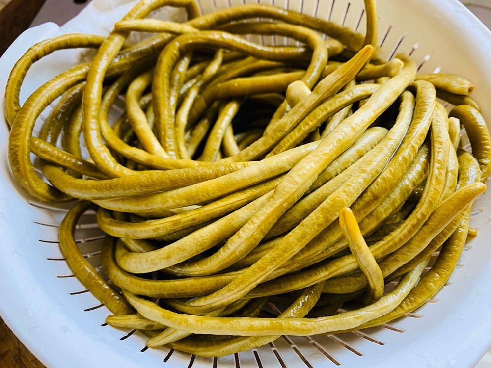 腌制酸豆角通常要选择豇豆来腌制,这是一种夏令的常见食物,极具生命力,越是天热的时候,结得越欢,所以每年这个时候,老妈都会把菜园里吃不完的豇豆趁着鲜嫩劲儿摘下来,腌成酸豆角,秋冬季节的食物也就有了。而老妈用的方法,还是奶奶教的,如今已经成家的我,也早已熟练掌握了奶奶的秘诀。腌制酸豆角成为每年夏天都要做的一件事情,这是传统习俗的一个延续, 也是传统美食的传承。好在家里人都喜欢吃酸豆角,可以将这个传统食物一直延续下去,从准备食材,到腌制,保存,再到烹制成美味端上餐桌,这一系列的过程只为了满足舌尖上的享受,更让人倍感生活的烟火气。
