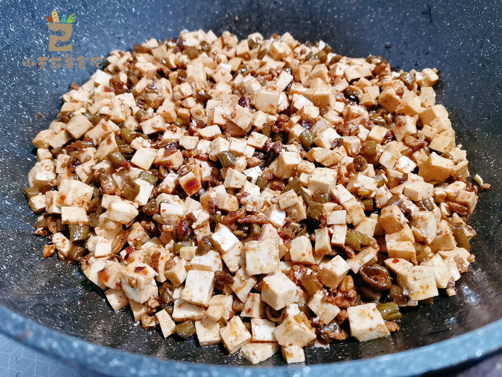 3、一块豆腐,先在蒸锅里边蒸十分钟,晾凉一些之后,切成小丁。