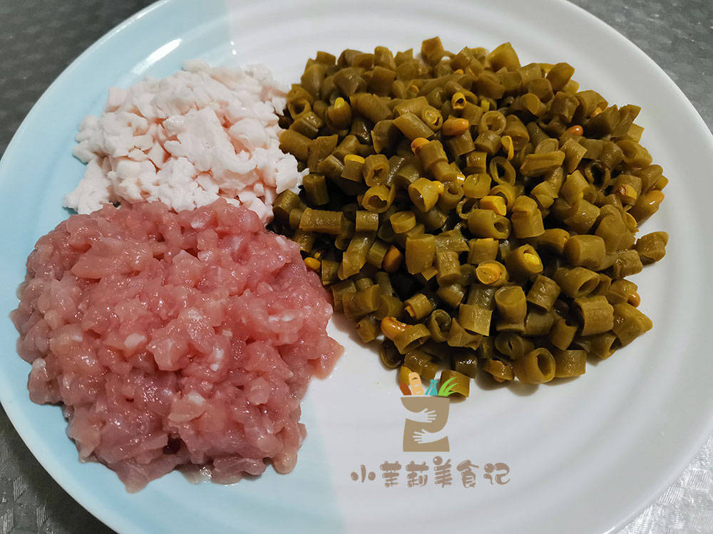 2、准备一些酸豆角洗干净,切成小丁。另外准备一些肉,肥瘦的部分分开来切。