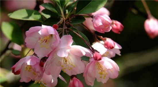 海棠,被称为“国艳”,一般于四月开放,晚于桃李,且花色淡雅,花朵深藏于浓密的绿叶之中,不似桃李那般竞相开放,占断春风。故而诗人元好问才说:“爱惜芳心莫轻吐,且教桃李闹春风。”