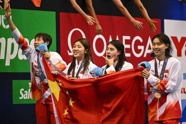 中国青年报客户端北京7月23日电(中青报·中青网记者慈鑫)在今晚结束的2023年福冈游泳世锦赛两项接力决赛上,中国队表现出色。女队由程玉洁、杨浚瑄、吴卿风、张雨霏出赛女子4X100米自由泳接力决赛,四位姑娘以3分32秒40的成绩夺得铜牌,并打破亚洲纪录;在随后进行的男子4X100米自由泳接力决赛上,中国队由潘展乐、陈俊儿、王长浩、王浩宇出赛,四名小伙子与澳大利亚、意大利、美国等强队展开激烈争夺,最终以3分11秒38的成绩排名第四,同样打破亚洲纪录。