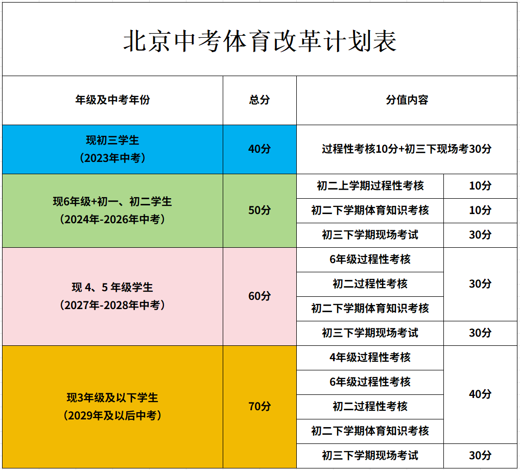 日前,北京市教委发布了《义务教育体育与健康考核评价方案》,《方案》指出北京市义务教育体育与健康考核评价包括过程性考核与现场考试,总分值70分,计入中考总分。其中,过程性考核40分、现场考试30分。体育与健康考核评价方案从2021年公布之日施行,分学段过渡、逐步推开。