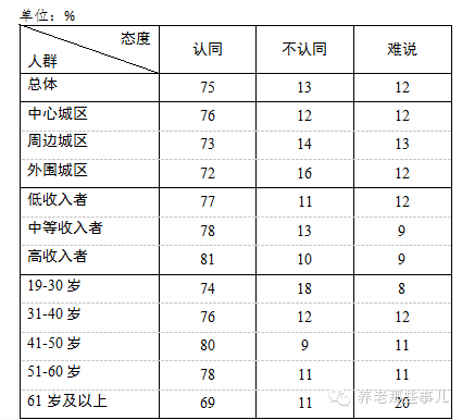 民调发现,政府推广的社区居家养老,比家庭养老和去养老院更符合市民的需求,对此持“认同”表态的受访市民高达75%,而“不认同”的仅13%;进一步分析来看,无论住在中心、周边、外围城区,无论收入高低,无论老年人还是子女辈,看法高度一致,认同比例基本过七成(见表1)。