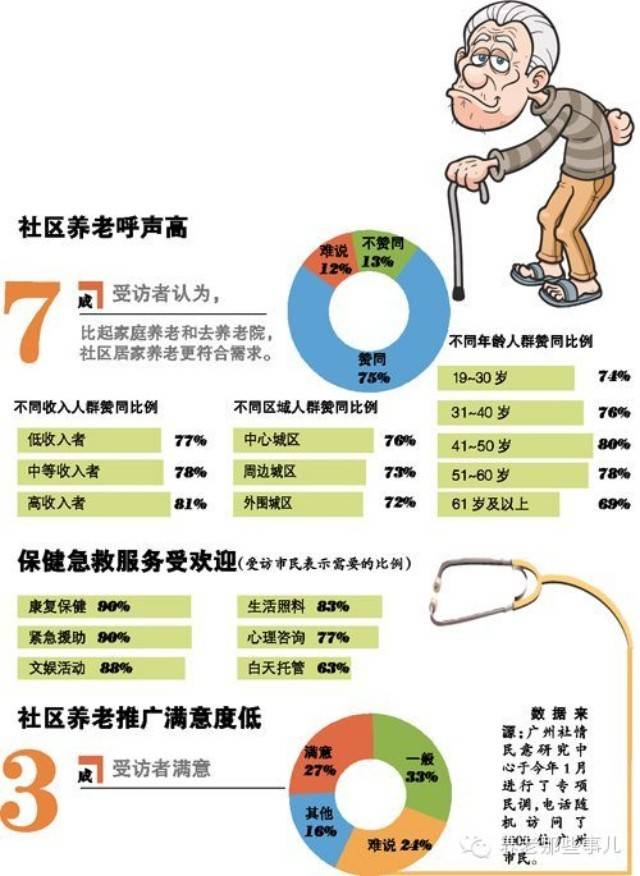 75%广州受访市民认为,比起家庭养老和去养老院,“社区居家养老”更符合市民需求。在社区养老服务机构提供的具体服务事项中,受访者认为最需要“康复保健”及“紧急援助”服务,九成人选中。