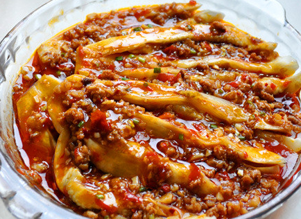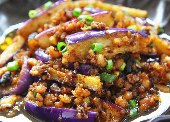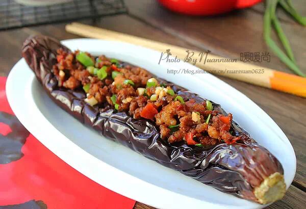 8、在茄身刀口处撒上炒好的肉丁,食用前将肉丁同茄肉拌一下味道更佳