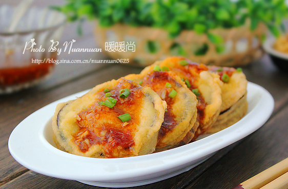 12、在炸好的茄盒上浇上适量的鱼香汁、撒上香葱末即可食用