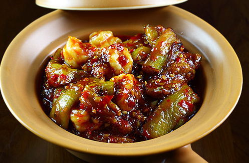 9、放入虾球和茄子,中火烧三分钟,中间稍微翻动一下,然后汁差不多快没了,勾芡出锅
