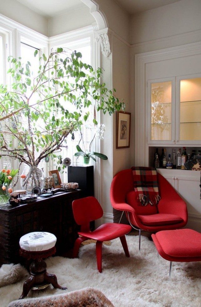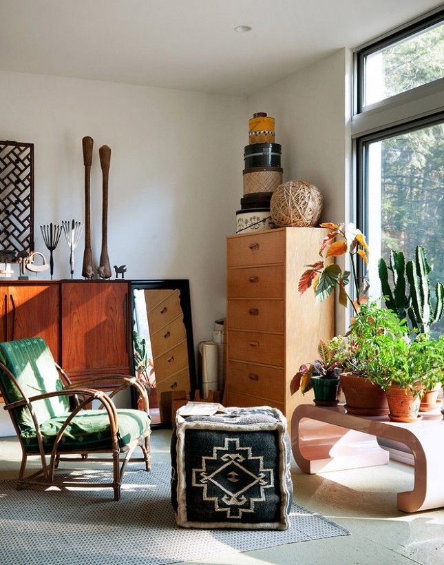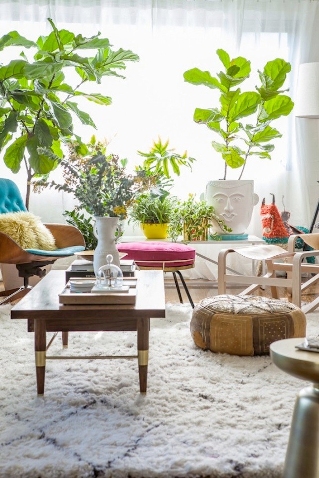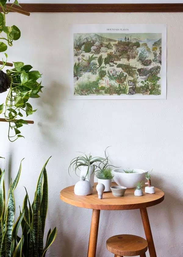 并不是总是要放在桌子上,在空间每个角落都有可能成为它的安置处,桌底下的大盆栽弥补了暗处的不足又增添了色彩。
