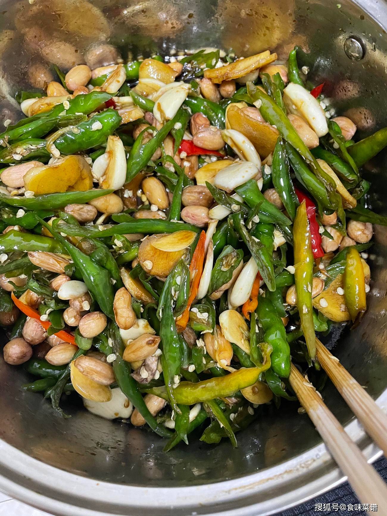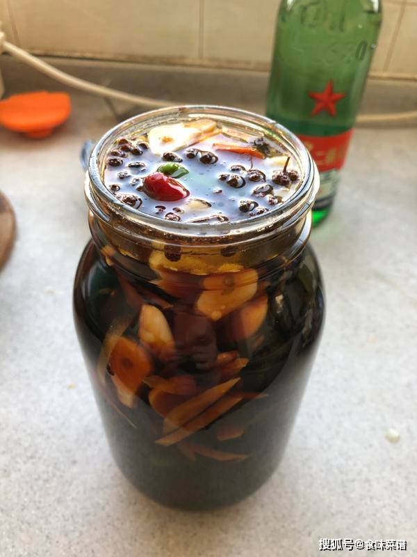 5、辣椒中放入蒜片和姜片,倒入晾凉后的料汁,再来一些水煮花生米,装入密封罐中,加一盖高度白酒,盖上盖上,腌制一周后,就可以食用了。