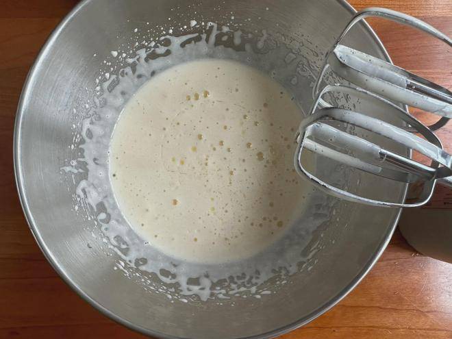 1、鸡蛋、白糖、糖浆倒在一起,糖浆可以用蜂蜜代替。打蛋器高度打发至发白的状态;再加入玉米油和黄油搅打均匀;