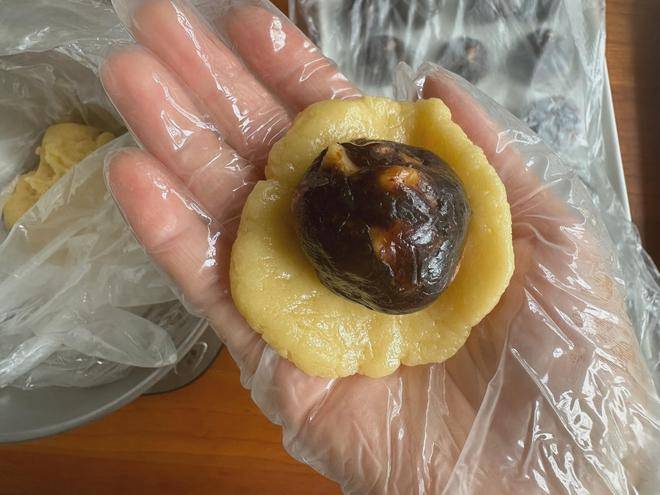 9、馅料要用油性比较软一点的馅料,像枣泥、凤梨这样比较湿性的馅料是最好的。