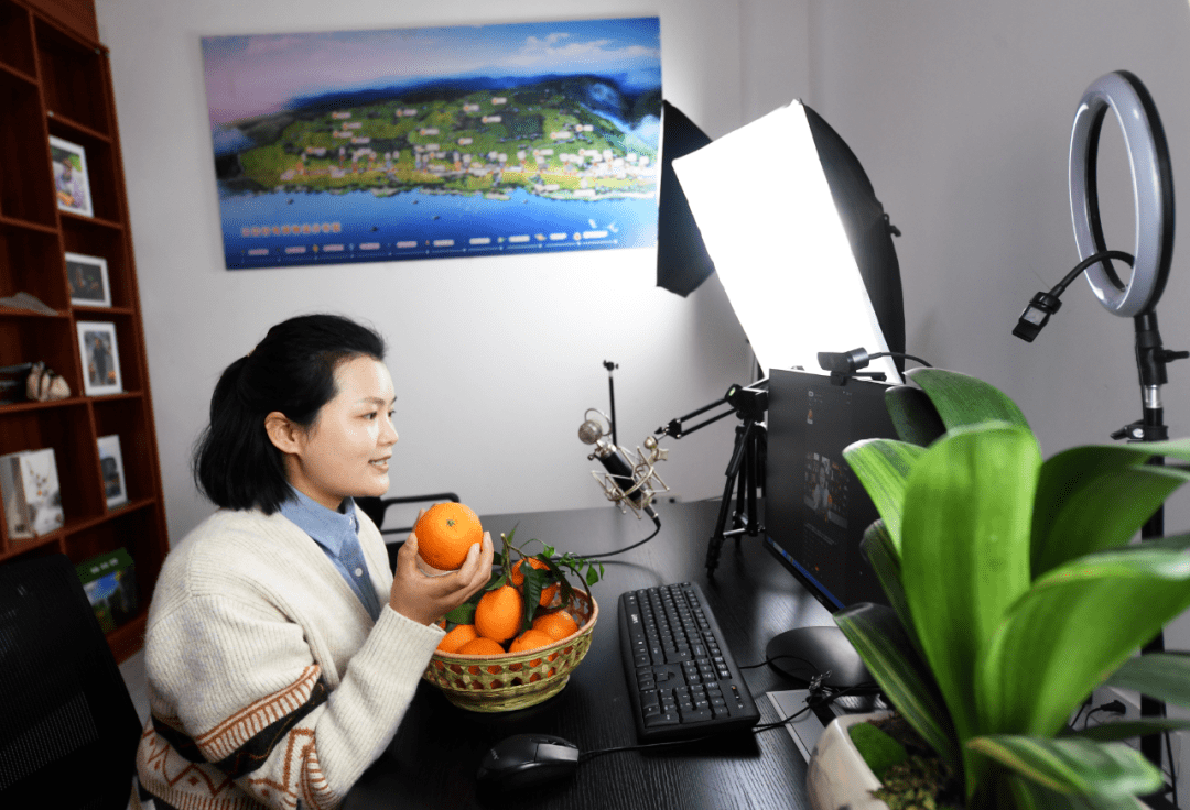 工作人员在奉节县安坪镇三沱村电商直播间推介脐橙产品 / 王全超 摄
