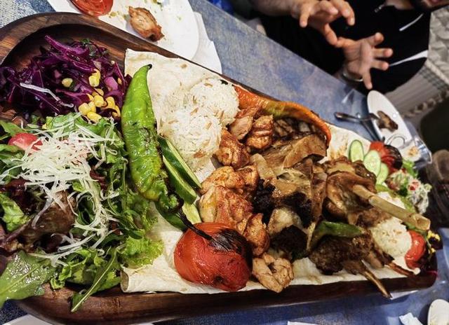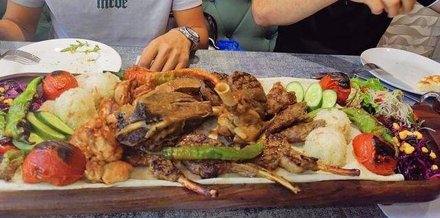 看看这么吃羊肉的吗?大块的羊肉搭配米饭,烤辣椒、烤西红柿、烤蔬菜等等,凉拌菜,满满一大盘子,新疆人豪爽的性格,不仅体现在性格上,在饮食上,更是体现的淋漓尽致!