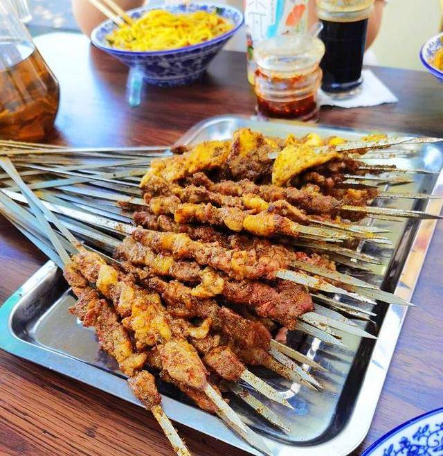 烤肉,也是外地人叫做的“羊肉串”,如果,你去烤肉店,说,老板来几串羊肉串,老板就知道,你是外地人!如果,你说来几个烤肉,老板就知道你是当地人,这是我们这里的习惯叫法“烤肉”,就是指的是羊肉串!吃拌面、吃凉皮,吃牛肉面都会搭配烤肉吃,哈哈,看看,这就是在吃拌面,搭配这么多烤肉哟!新疆人吃烤肉,那叫一个攒劲!