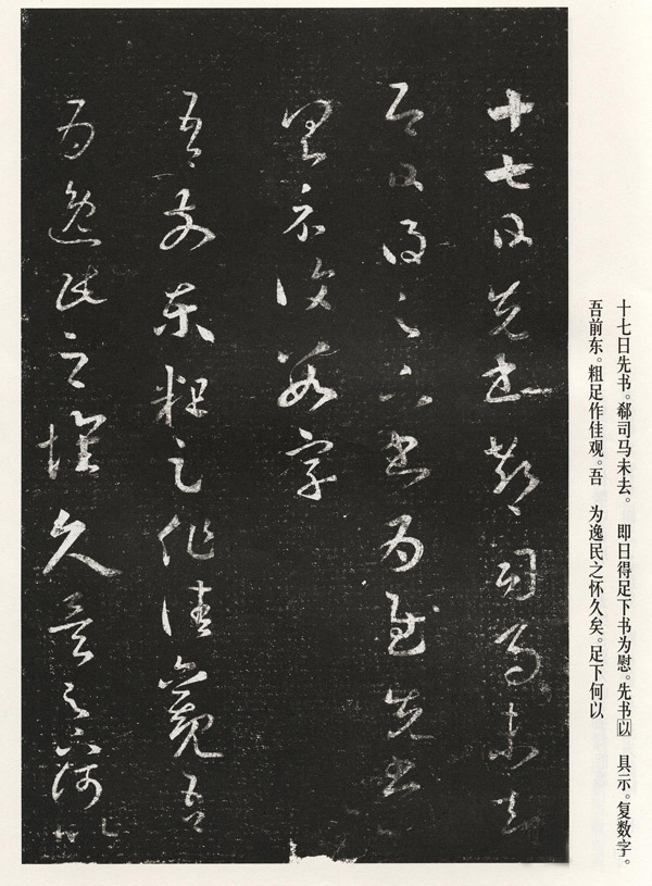 《十七帖》是著名的王羲之草书代表作,因卷首由“十七”二字而得名。原墨迹早佚,现传世《十七帖》是刻本。唐张彦远《法书要录》记载了《十七帖》原墨迹的情况:“《十七帖》长一丈二尺,即贞观中内本也,一百七行,九百四十三字。是煊赫著名帖也。太宗皇帝购求二王书,大王书有三千纸,率以一丈二尺为卷,取其书迹与言语以类相从缀成卷。”此帖为一组书信,据考证是写给他朋友益州刺史周抚的。书写时间从永和三年到升平五年(公元347-361年),时间长达十四年之久,是研究王羲之生平和书法发展的重要资料。清人包世臣有《十七帖疏征》一文可以参考。
