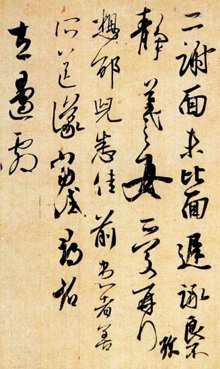 此帖出自王羲之草书《十七帖》,全文见《右军书记》:‘得足下旃、胡桃药二种,知足下至,戎盐乃要也,是服食所须。知足下谓须服食,方回近之,未许吾此志。知我者希,此有成言,无缘见卿,以当一笑。’现存此帖已残,仅存21字。释文 ……回近之,未许□□□。知我者希,此有成言。无缘见卿,以当一笑。