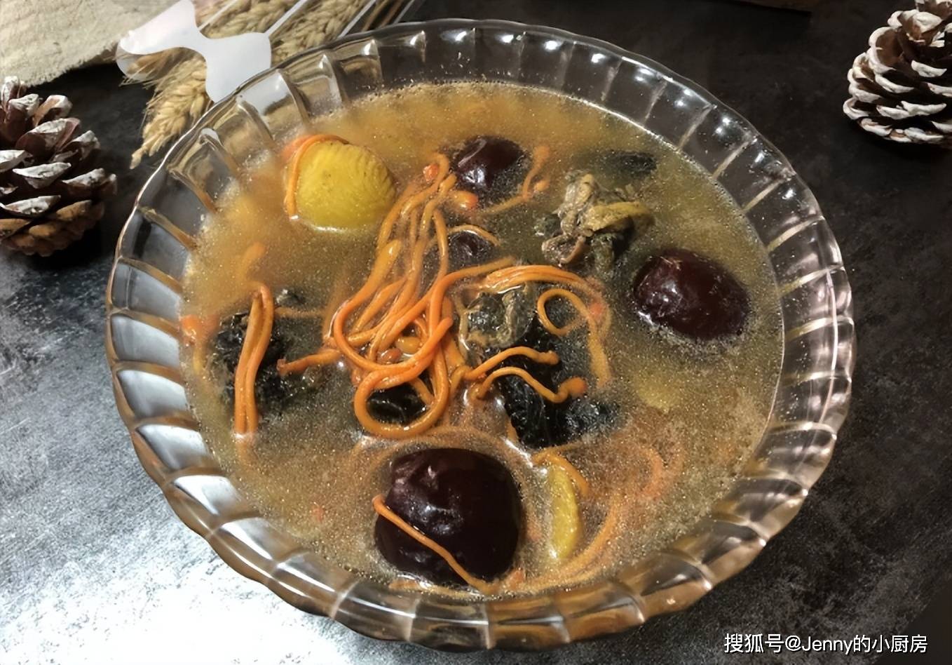 最后放入板栗、红枣、虫草花,再继续煮半个小时。煮好后加盐调味,这道汤就做好了。