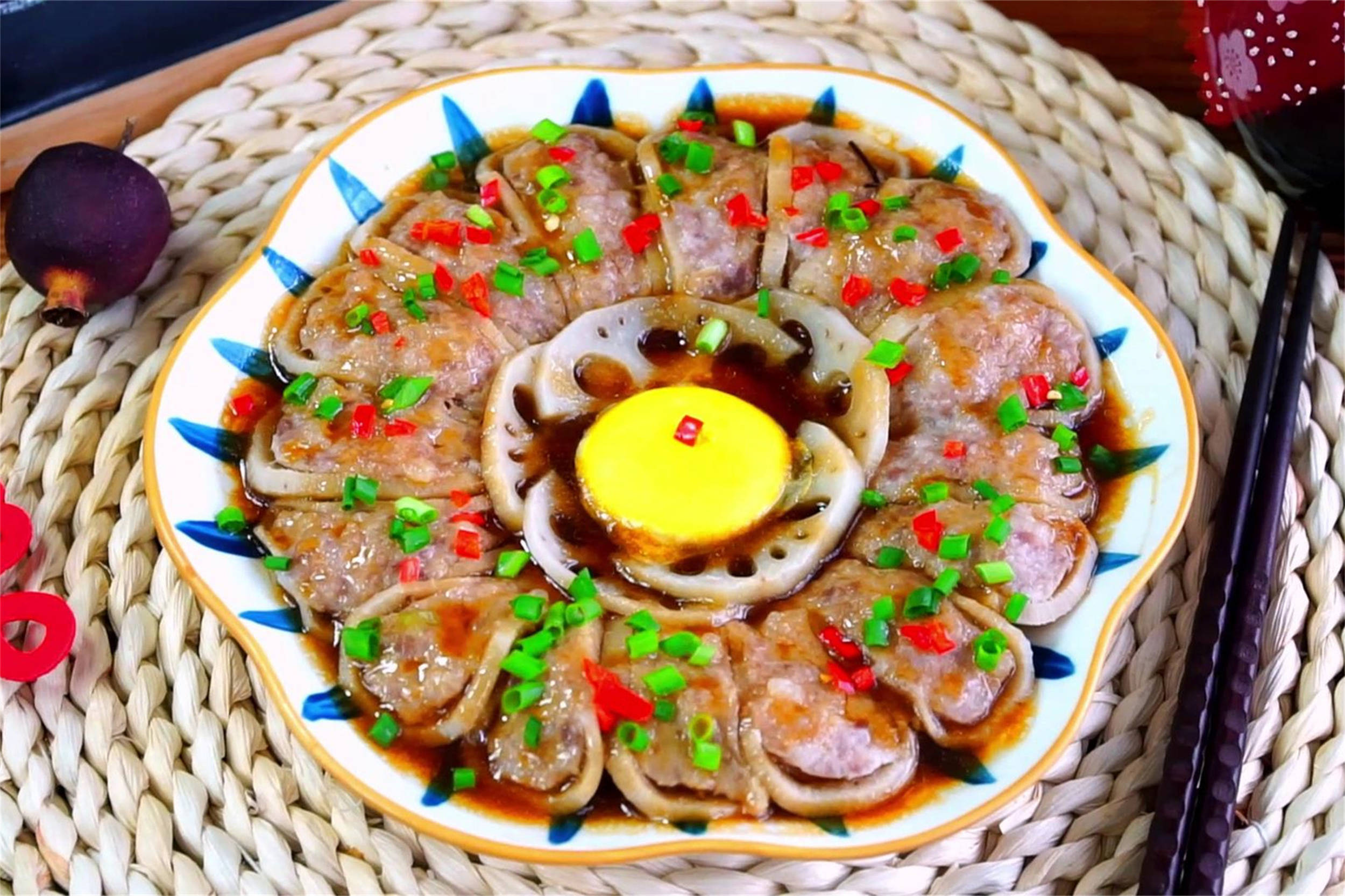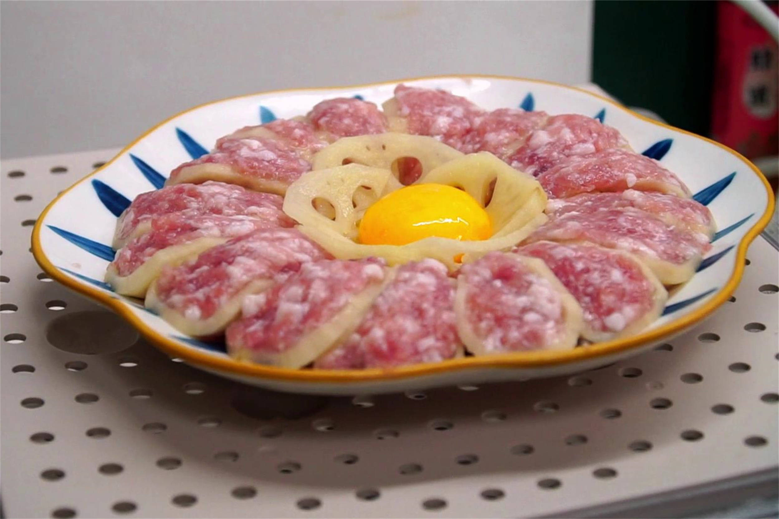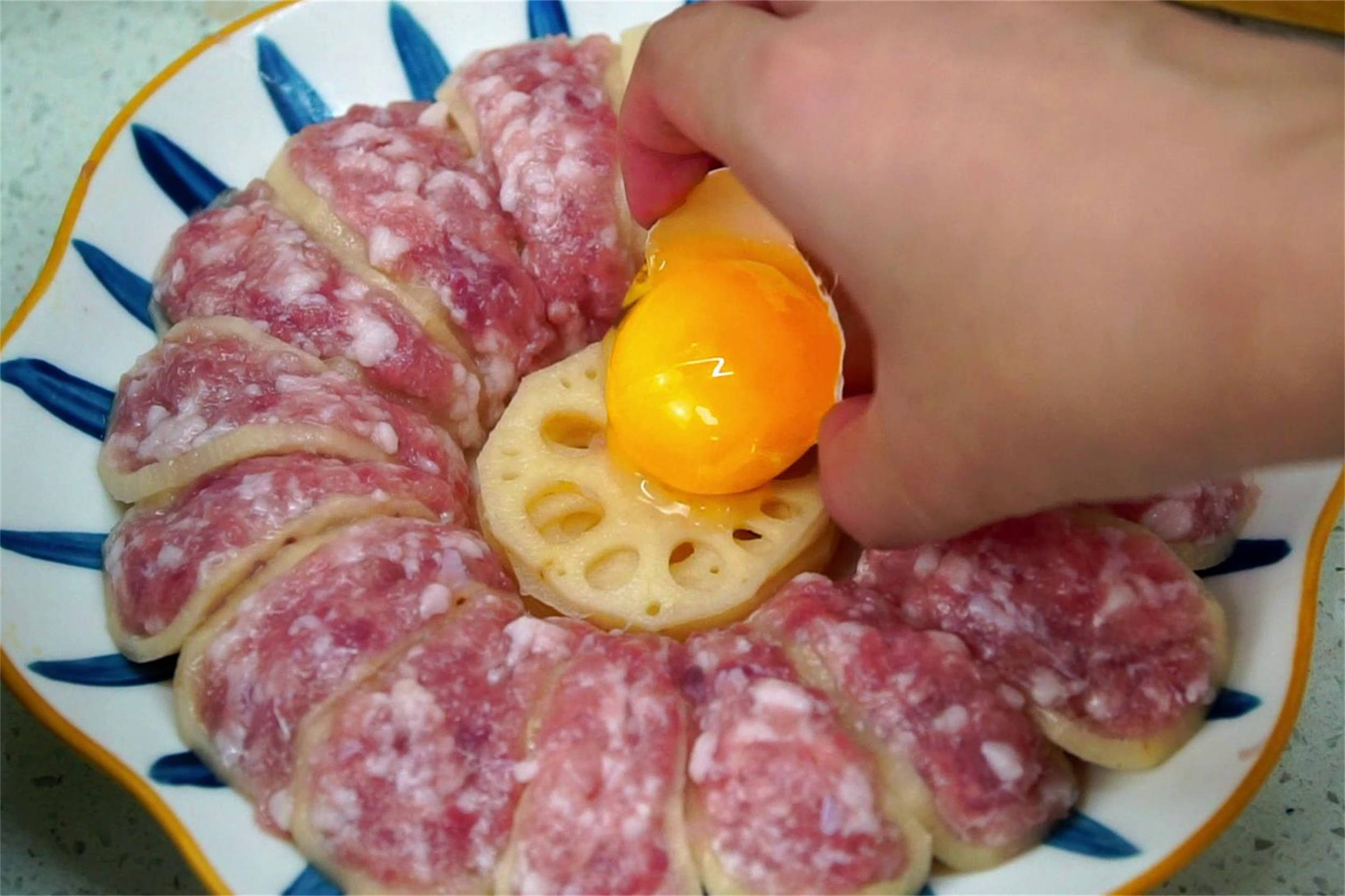 3、莲藕浸泡软后,放上适量的肉片,捏合后码在盘子上,中间再放上几片莲藕,蛋黄倒入中间。